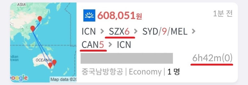 반면, 남방항공의 호주행 운임은 스톱오버가 무료입니다. 이 항공권처럼, 시드니 in 멜버른 out 여정에 선전과 광저우를 며칠씩 덤으로 여행하는 항공권이 60만원입니다. 물론, 이 항공권도 선전과 광저우에서 무료 환승 호텔을 제공받을 수 있습니다. 앞에서 살펴본 무료 환승 호텔을 제공하는 조건 중 환승 시간은 6~240 시간 사이였거든요. 물론, 첫 1박만 제공받을 수 있습니다.