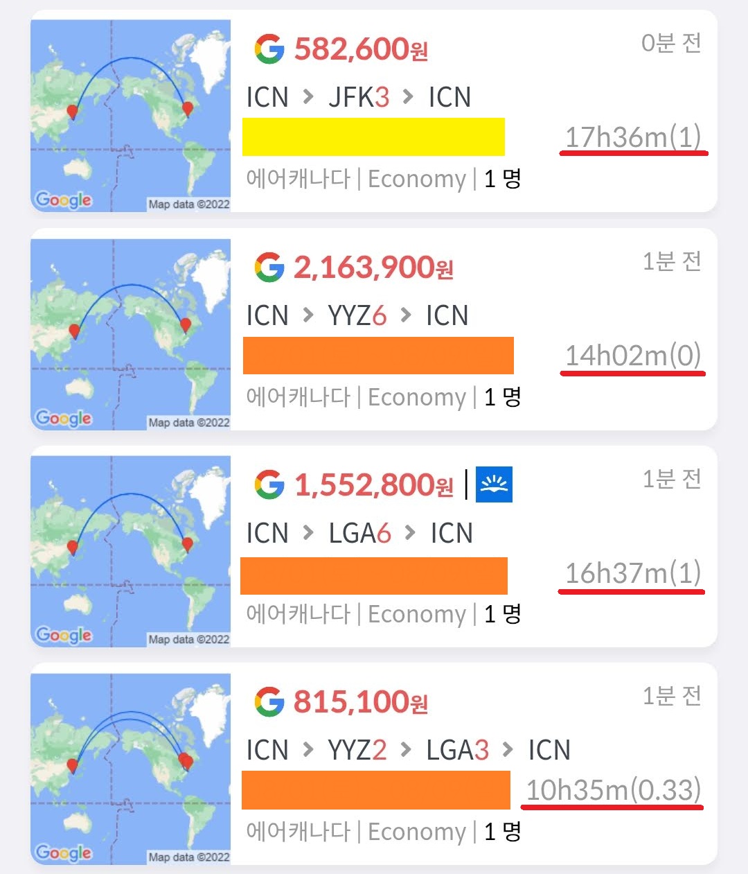 출발은 맨 위의 뉴욕 왕복 항공권입니다. 여름 초성수기 에어캐나다의 뉴욕 왕복 항공권이 구글에서 58만원입니다. 구글이 제공하는 항공사 홈페이지 구입가는 63만원이고 네이버 카드 할인 최저가는 55만원입니다.