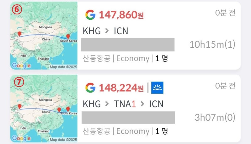 그런데요. 우연히 발견한 놀라운 가격의 항공권을 발견했습니다. 카스 - 서울 편도가 14만원(⑥번 항공권)까지 가능하더군요. 경유지인 지난에 스톱오버를 추가해도 거의 같은 가격인 14만원(⑦번 항공권)입니다.