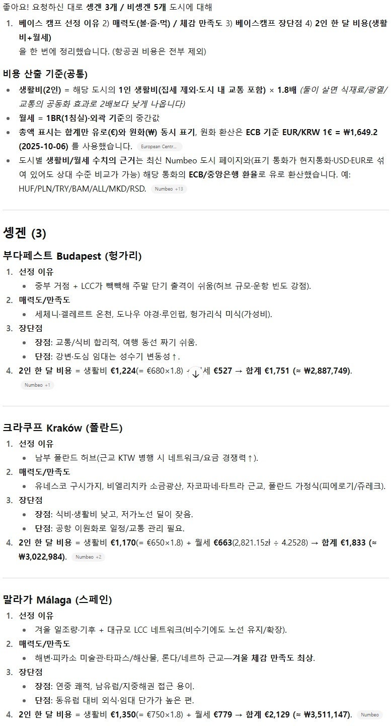 베이스 캠프는 ① 생활비(음식료/시내 교통 등)와 숙소 월세가 저렴하고, ② 유럽 내 항공 노선이 많고 가격도 저렴해야 하며, ③ 도시 자체의 볼거리, 즐길거리, 먹거리도 풍부해야 합니다. 3개월이 넘는 장기 여행이라면 솅겐 90일 체류 조건을 피할 수 있도록 비솅겐 지역에 베이스 캠프를 차리는 것이 좋겠죠. 다음은, 이런 조건으로 ChatGPT에게 베이스 캠프 후보 도시를 선정하고 정리를 시켜본 결과입니다. 물론, 한 번에 이 모든 결과를 다 얻어낸 것은 아니고 꽤 긴 시간 대화를 나누고 최종 정리를 시켰습니다.