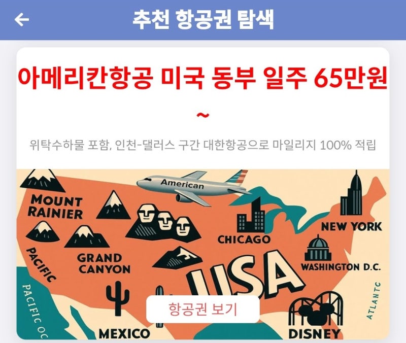 아메리칸항공 미국 동부 일주 65만원~ 대한항공으로 마일 적립!