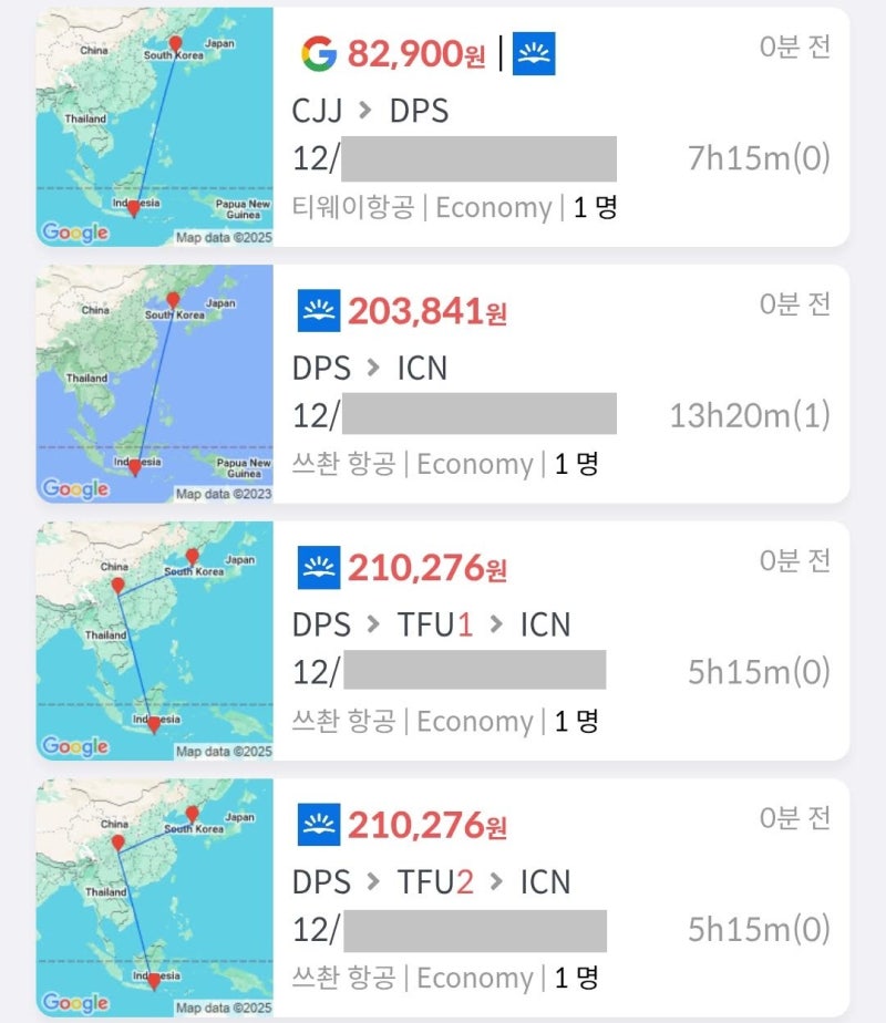 발리에서 돌아오는 항공권은 이렇게 탐색하면 됩니다. 두 링크 모두 항공사는 제약을 두지 않았으니 티웨이나 쓰촨 항공이 아닌 다른 항공사도 충분히 가격이 좋다면 순위권에 보일 수 있습니다.